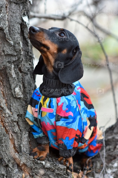 Такса собака сидит возле дерева. Выгул собак в плохую погоду. Теплая одежда для собак