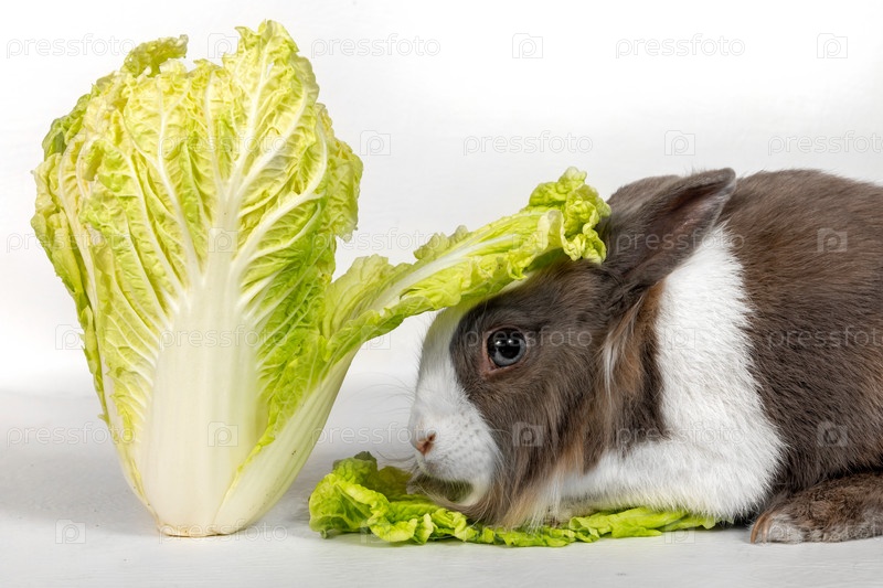 Портрет серого кролика с зеленой капустой на белом фоне. Домашний кролик ест капусту и смотрит в сторону