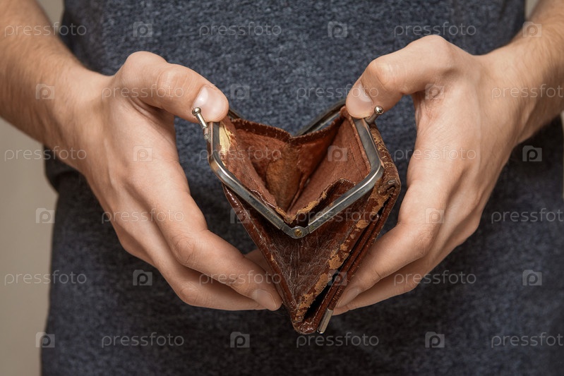 Пустой кошелек в руках молодого человека, концепция банкротства