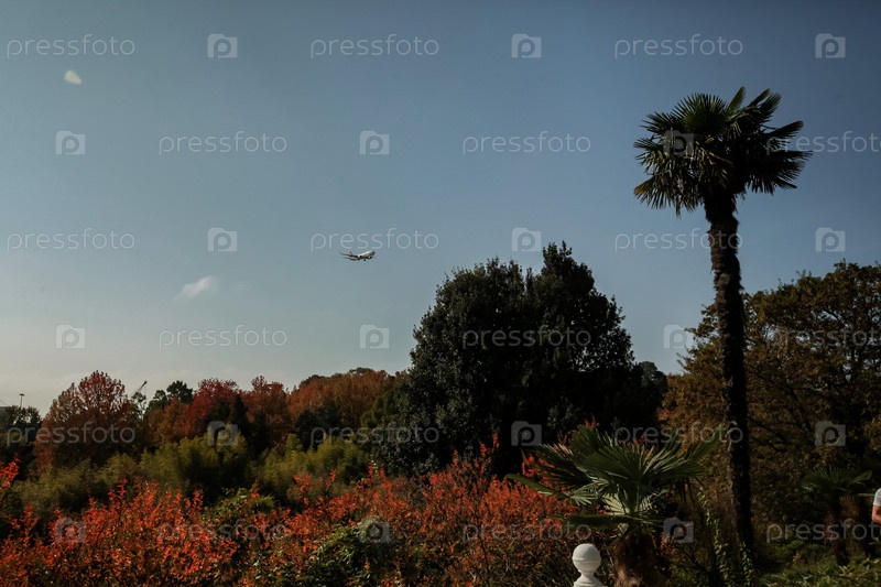 Самолет в закатном небе в Египте через пальмы Самолет летит сквозь пальмы