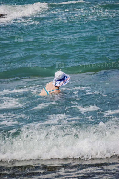 Веселая пожилая женщина старше 65 лет купается в синем море, смеется и наслаждается летним днем, окончанием карантина и самоизоляции
