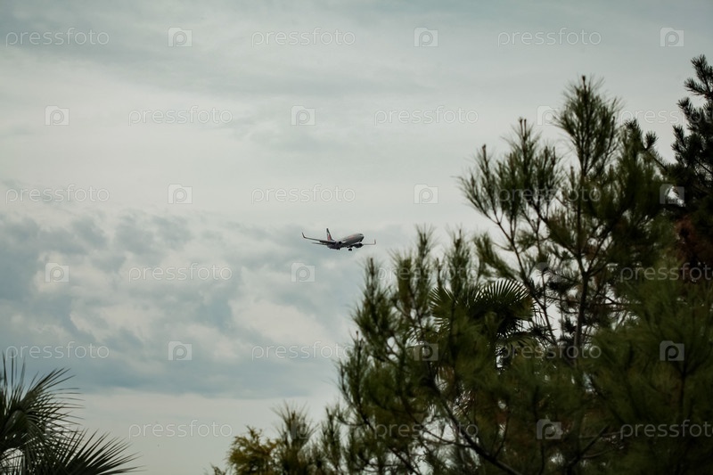 Самолет в закатном небе в Египте через пальмы Самолет летит сквозь пальмы