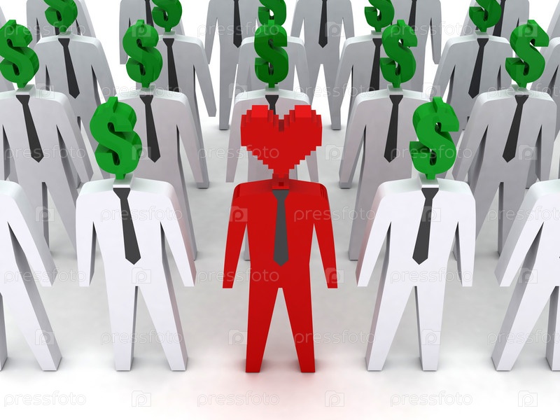 Люди с долларами на месте головы и один человек с головой в форме сердца