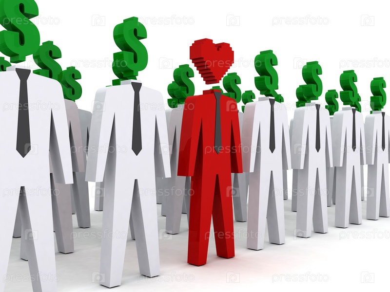 Люди с долларами на месте головы и один человек с головой в форме сердца