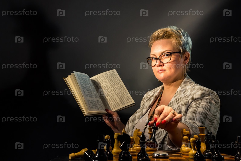 Портрет интеллигентной молодой женщины в элегантных очках, читающей книгу, сидящей в кресле в темной комнате библиотеки, на фоне книжного шкафа. Серьезная деловая женщина планирует стратегию развития. женщины за шахматной доской с книгой