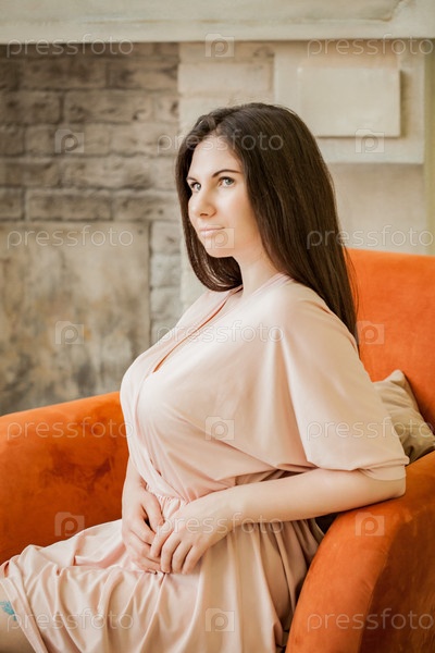 Портрет красивой женщины в халате, сидящей дома в уютном кресле