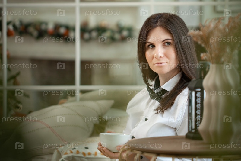 Портрет красивой женщины в белой рубашке, отдыхающей в спальне. Молодая женщина в белой рубашке пьет чай дома