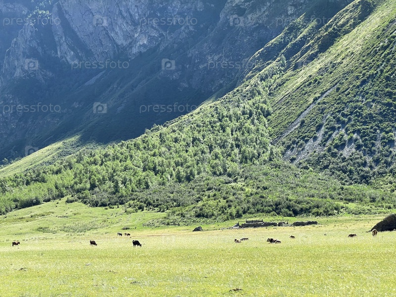 Красивый горный пейзаж, коровы пасутся на зеленом лугу вдалеке, Алтай, Россия