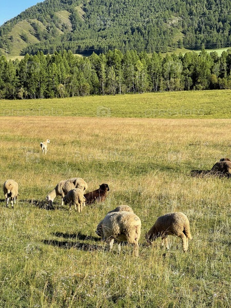 Овцы пасутся в лучах заходящего солнца на пастбище в Алтайских горах, Россия