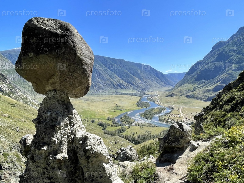 Прекрасный вид на горную долину с Каменных Грибов, заливные луга и реку с островами, Чулышман, Алтай, Россия