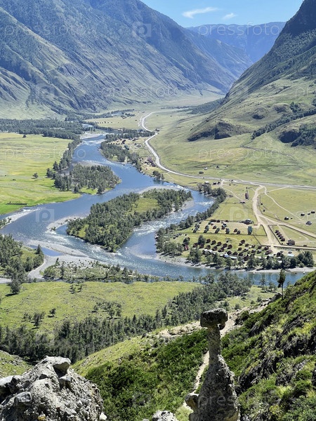 Панорамный вид на долину Чулышман и реку Чулышман из Каменных Грибов, Алтай