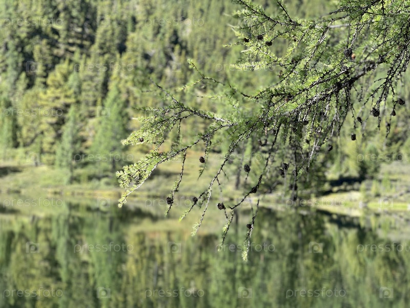 Ветка лиственницы у озера в горах Алтая, Россия
