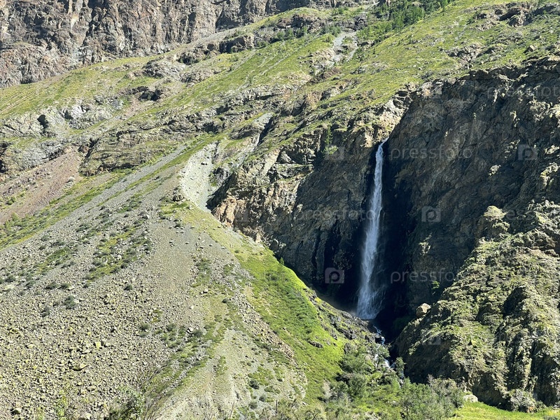 Высокий безымянный водопад в Чулышманской долине, Алтай, Россия