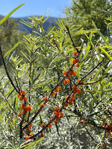 Спелая облепиха на ветвях в горах Алтая, Россия