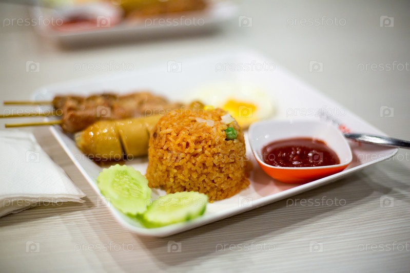 Блюдо в азиатском ресторане или кафе. Тайский рис с соусом на тарелке