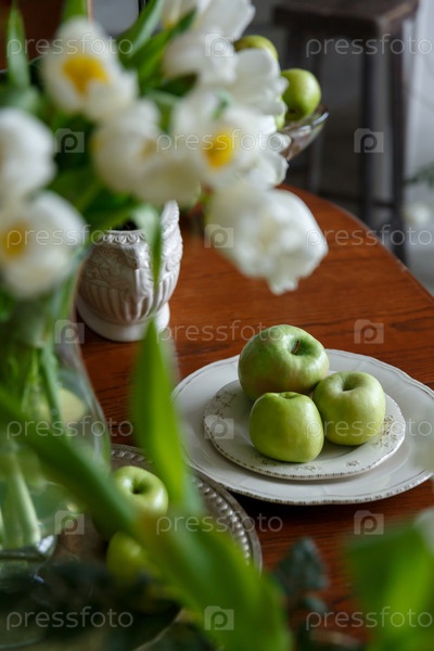 Зеленые яблоки на фарфоровой тарелке на столе