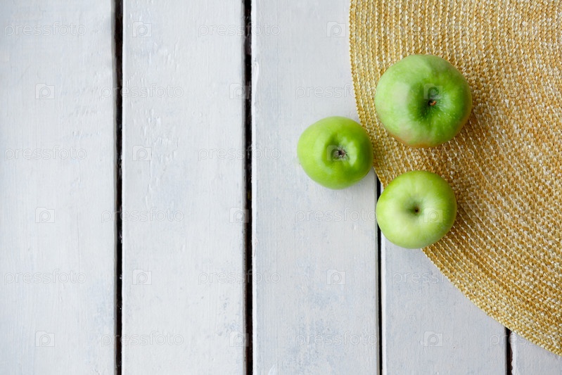 Зеленые яблоки на соломенной шляпе и на фоне деревянных досок