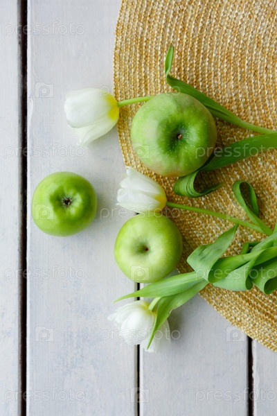 Зеленые яблоки и тюльпаны на соломенной шляпе и на фоне деревянных досок