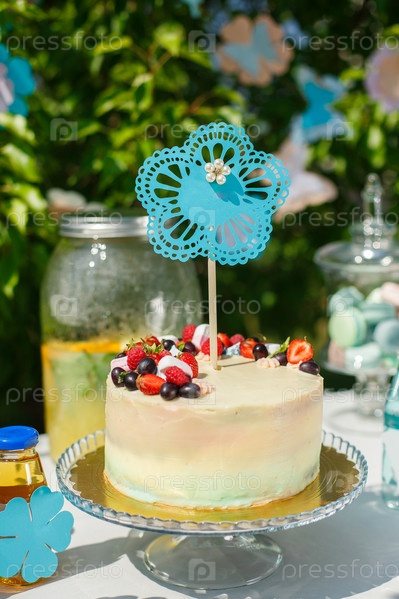 Торт украшен цветной глазурью, клубникой, виноградом и зефиром