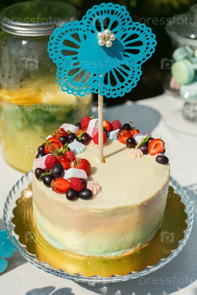 Торт украшен цветной глазурью, клубникой, виноградом и зефиром