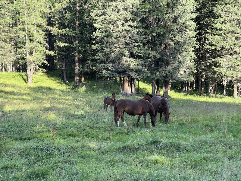 Дикие лошади пасутся на лугу возле леса