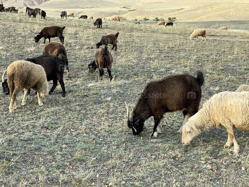 Горные козлы и овцы пасутся на лужайке в горах в осенний день
