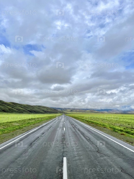 Дорога уходит вдаль в горы, часть Чуйского тракта, Алтай, Россия