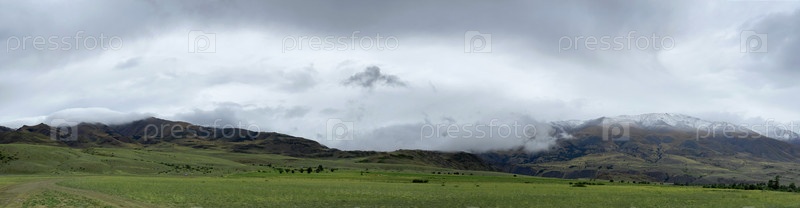 Панорамный вид на горный пейзаж Алтая. Облака лежат на вершинах заснеженных гор. Чуйская степь в Кош-Агачском районе, Алтай, Россия
