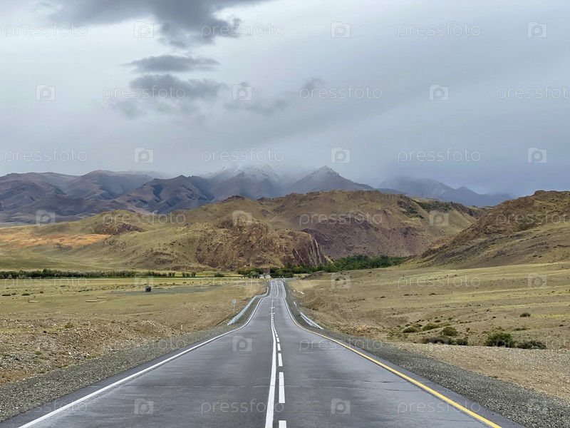 Асфальтовая дорога в горах Алтая. Дорога, уходящая вдаль в горы. Часть Чуйского тракта, Алтай, Россия