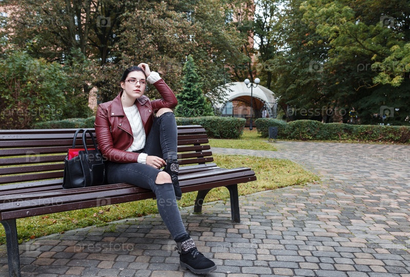 Молодая девушка в коричневой куртке и черных джинсах сидит осенью на скамейке в парке