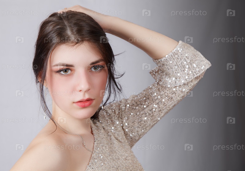 Портрет молодой красивой брюнетки в ярком платье в студии на светлом фоне