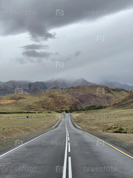 Дорога уходит вдаль в горы, часть Чуйского тракта, Алтай, Россия
