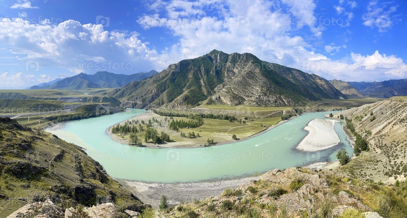 Панорамный вид на место впадения реки Чуя в Катунь. Бирюзовая река изгибается, как подкова. Алтай, Россия