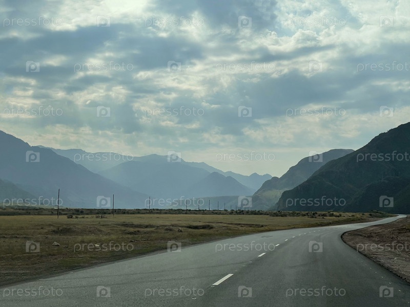 Асфальтовая дорога в горах Алтая. Дорога, уходящая вдаль в горы. Часть Чуйского тракта, Алтай, Россия