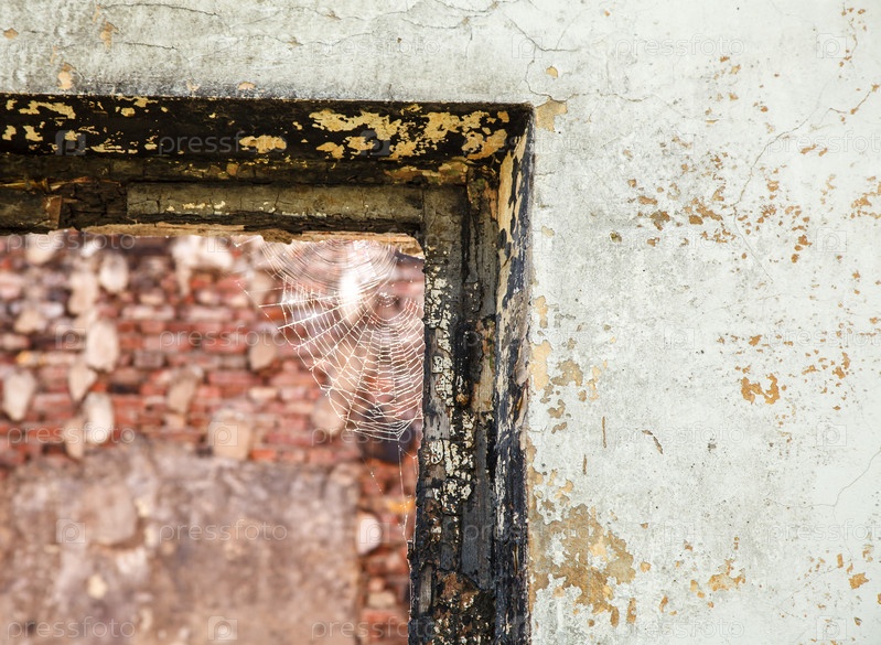 Разбитое окно с паутиной в заброшенном доме