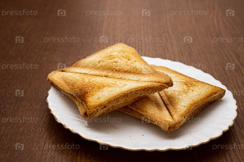 Два поджаренных румяных и аппетитных ломтика хлеба на белой тарелке. закрытый крупным планом