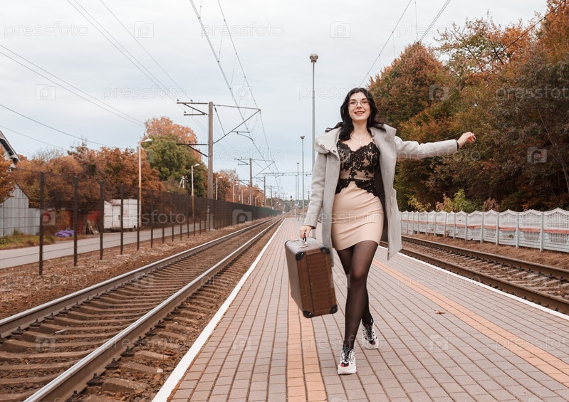 Маленькая девочка в сером пальто с чемоданом идет вдоль вокзала