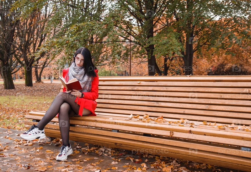Молодая девушка читает книгу, сидя на скамейке в парке