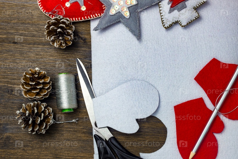 Яркие новогодние игрушки из фетра. Ножницы, карандаш, нитки и шишки на деревянном столе. Домашние легкие елочные игрушки для детей