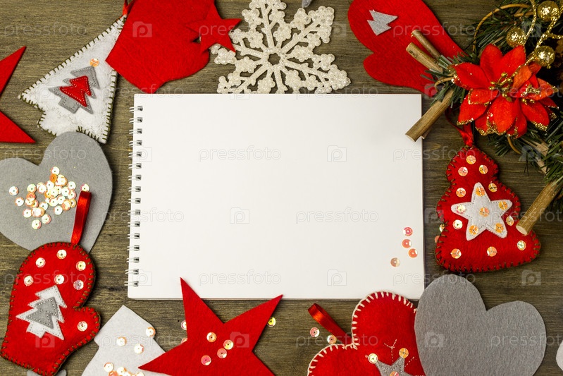 Рождественские игрушки из войлока ручной работы и блокнот на темно-коричневом деревянном фоне