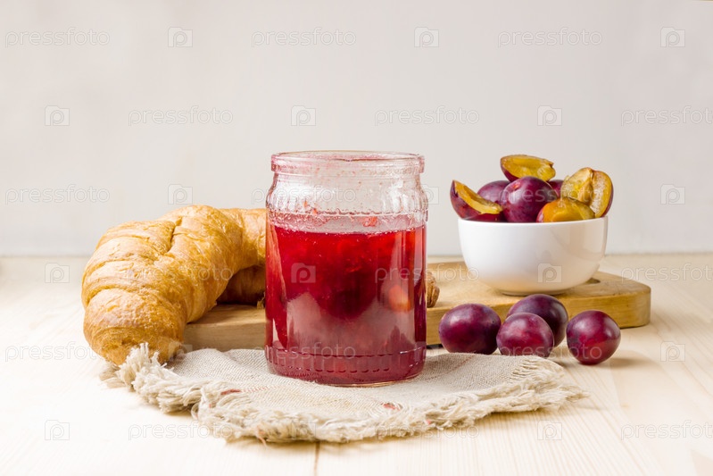 Домашнее сливовое варенье в стеклянной банке. Сливовый джем, круассаны и спелые сливы на заднем плане. Высокий ключ. Выборочный фокус
