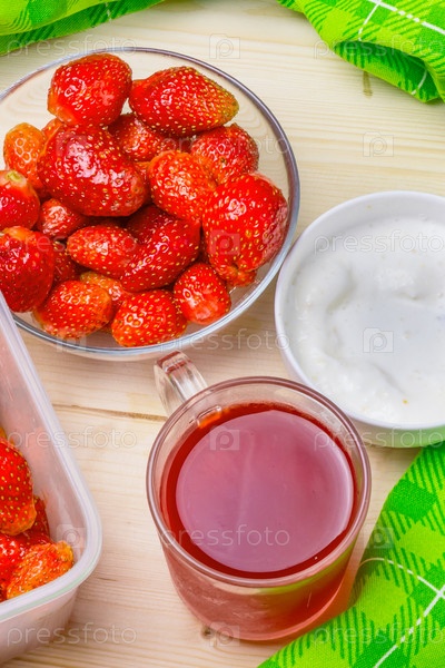 Свежая клубника в стеклянной миске, свежий клубничный морс, сливки в белой керамической миске, зеленое полотенце в клетке на светлом деревянном фоне