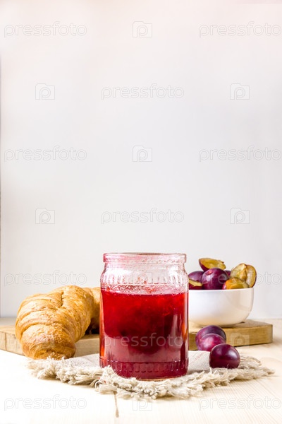 Домашнее сливовое варенье в стеклянной банке. Сливовый джем, круассаны и спелые сливы на заднем плане. Высокий ключ. Выборочный фокус