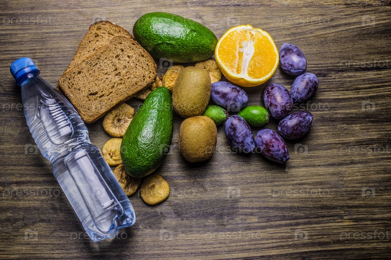 Здоровая еда на столе для перекуса. Бутылка воды. Ломтики хлеба, банан, апельсин, киви, инжир, фейхоа и сливы. Место для текста