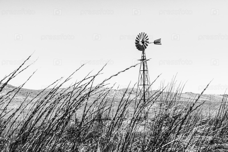 Традиционная австралийская ветряная мельница, стоящая у дороги, Австралия. Черно-белое изображение