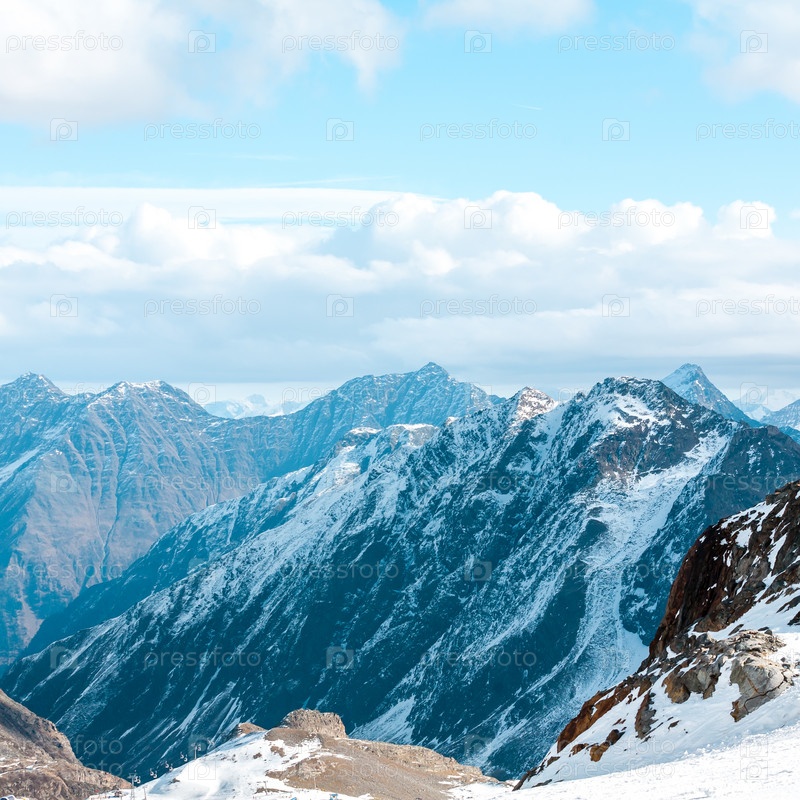 Высокий скалистый горный пейзаж. Красивый живописный вид на гору. Горнолыжный курорт Альп. Австрия, Штубай, Stubaier Gletscher