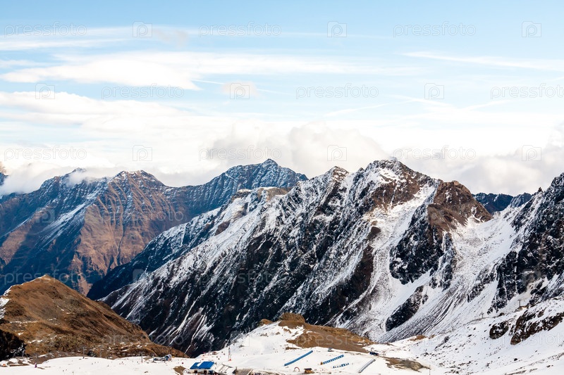 Высокий скалистый горный пейзаж. Красивый живописный вид на гору. Горнолыжный курорт Альп. Австрия, Штубай, Stubaier Gletscher