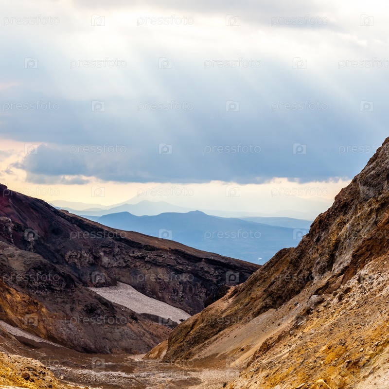 Лучи солнца пробиваются сквозь тучи. Закат на вулкане Мутновский, полуостров Камчатка, Россия