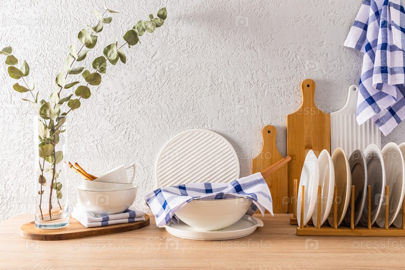 Современный интерьер кухни с различной кухонной утварью на деревянной столешнице. миски, разделочные деревянные доски, тарелки. передний план. чистый дом