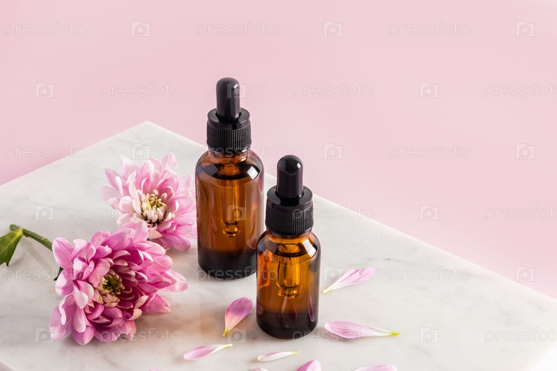 Два косметических флакона из янтарного стекла с пипеткой с натуральным средством для ухода за кожей лица и тела стоят на мраморном подиуме с цветами
